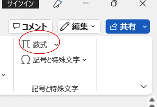 まず,数字や文字を選択して打ち込む方法について説明します.Microsoft Wordの[挿入]タブを選択し,リボン右端にある(下図参照)[数式]をクリックします.