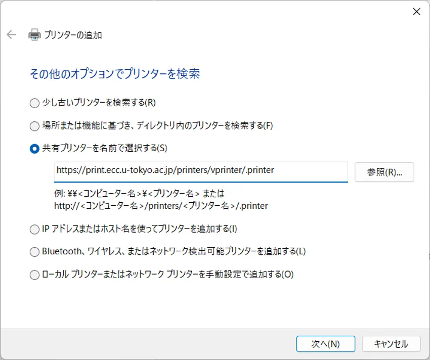 「その他のオプションでプリンターを検索」画面が開きます.「共有プリンターを名前で選択する(S)」をチェックし,直下のフォームに