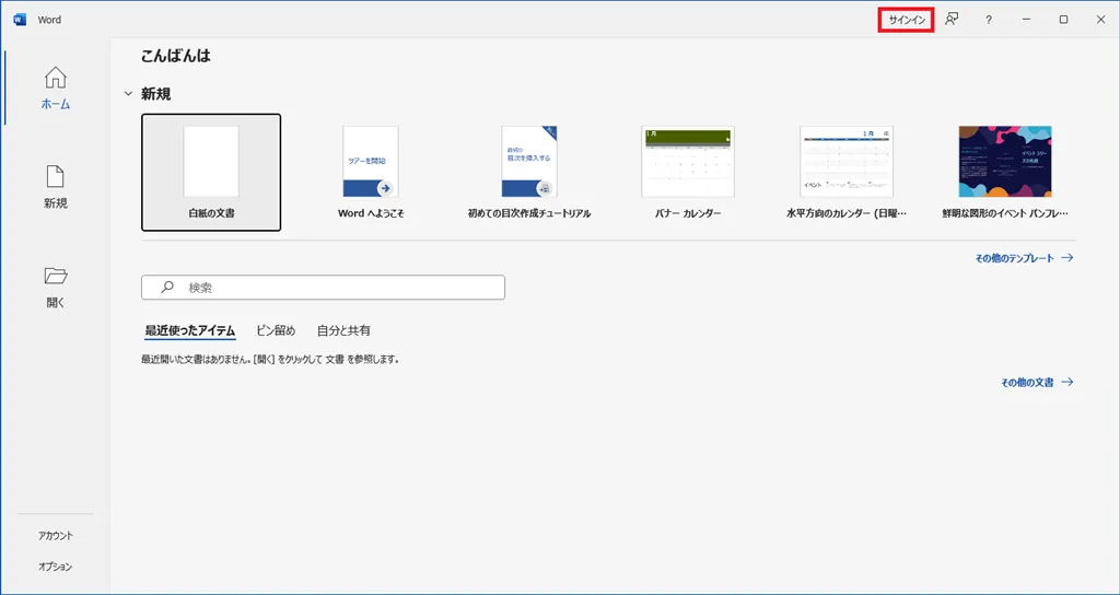 直前にライセンス認証を行っていない場合は,画面右上の「サインイン」をクリックして,UTokyo Accountへサインインしてください.その後,スタート画面左側の「開く」から利用できます.