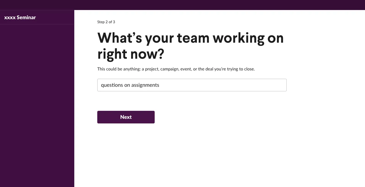 - Set up the workspace (e.g. class name). The “company or team name” will be the name of the workspace. It is recommended that you use a workspace name that makes its purpose easily recognizable (e.g. which class the workspace is for). In this example, the workspace is named “xxxx Seminar”.