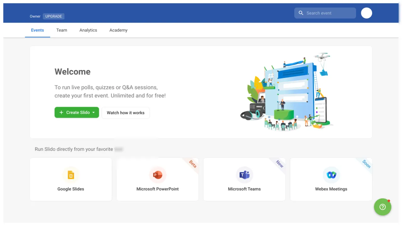 - Select “Create Slido” or “New Slido” on the screen, and then enter the “Event name” and “Start date.”