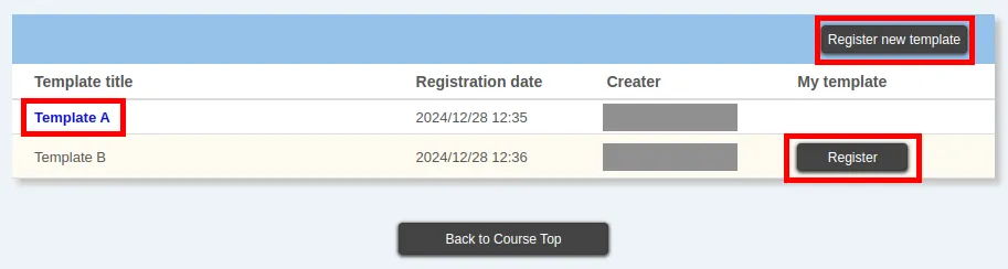 3. Click “Register new template” to register a new template, or click the title of the corresponding template to edit the existing one. Click “Register” in the “My template” field of the relevant template to create a copy of another user’s template.