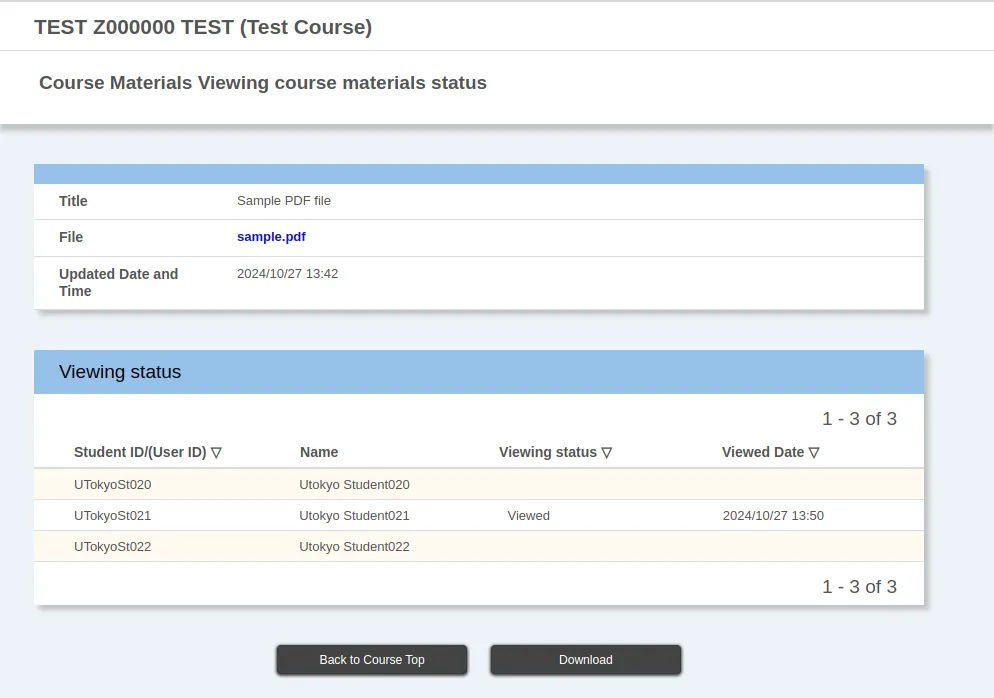 The course instructors and TAs can check which enrolled students have viewed the course materials and when they did it. The view status can be checked on UTOL. It can also be downloaded as an Excel file format (a password must be set for the file).
