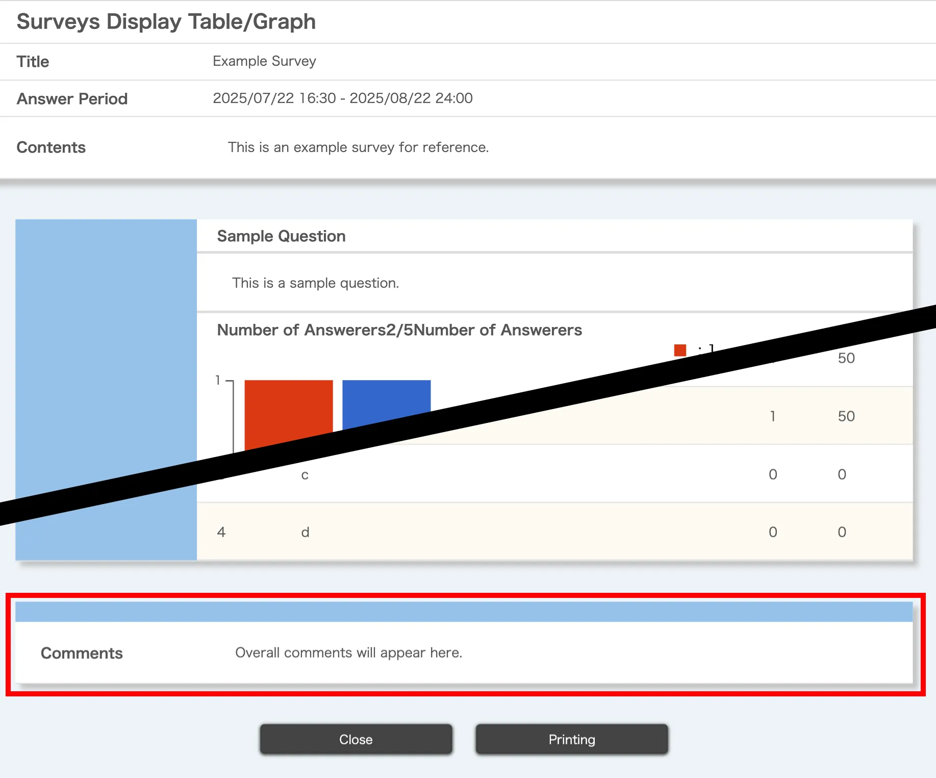 Please note that by default, the “Disclose survey result” setting is set to “Not Disclose”, meaning the aggregated results are not available to students. In this state, students cannot open the “Table/Graph” screen, and any comment you add will also not be available to them. For details on how to change the “Disclose survey result” setting, please refer to “Creating and Editing Surveys > Setting up the entire survey”.