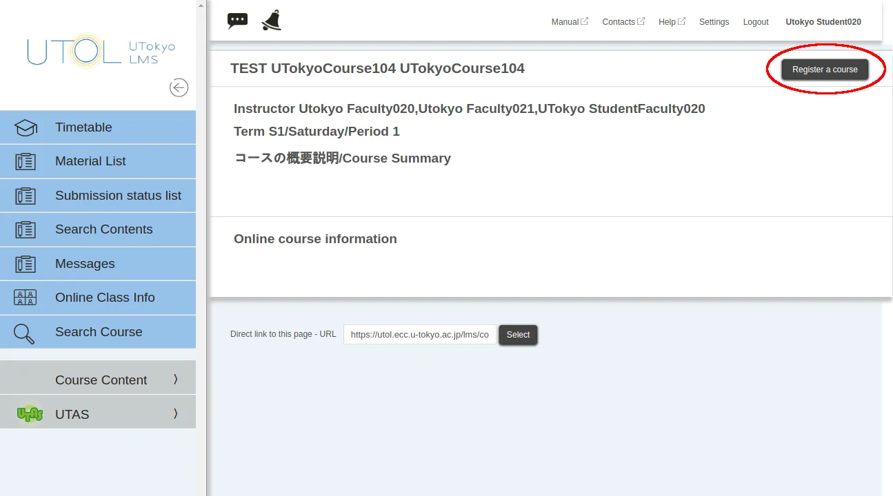 - This is a “self-registration” that can be made by clicking the button “Register a course” on UTOL. (This registration may be deleted after the enrollment registration period.)