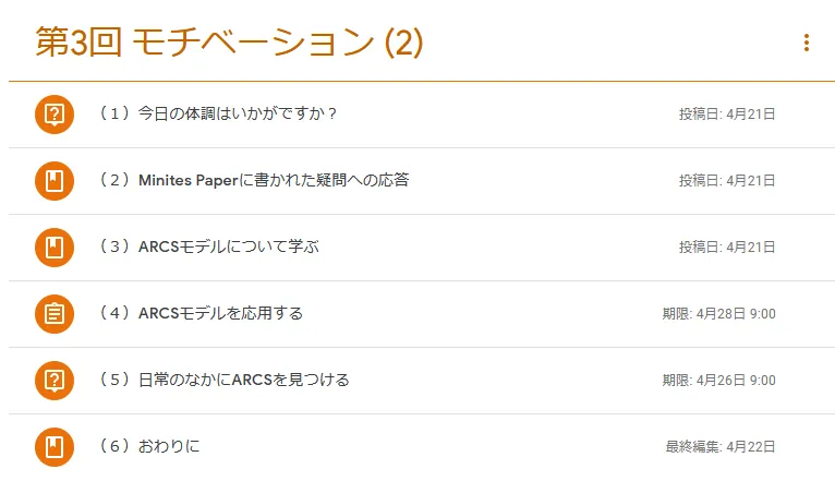 この授業ではオンデマンドを 2 回とりいれました。一人の学習はモチベーションをあげるのもなかなか大変だと思いましたので、自然と学べるような構成を工夫しました。たとえば、第 3 回はモチベーションについてさらに学ぶ回でしたが、体調について答える「つかみ質問」にはじまり、前回の質問への解説動画、理論についての説明動画、レポート課題2つ、振り返り、という構成としました。MOOC(Massive Open Online Course)の作成経験があったので、時間の短い複数の動画とクイズを組み合わせるという一般的な MOOC の流れを参考にしました。