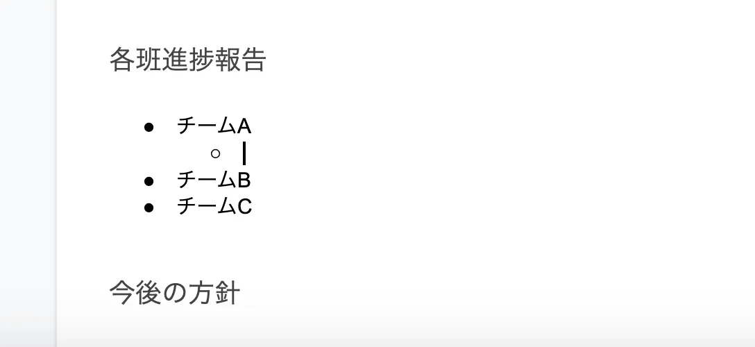 一段深い階層の箇条書きを追加する場合は,Enterキーを押して箇条書きを追加したあと,Tabキーを押してください.