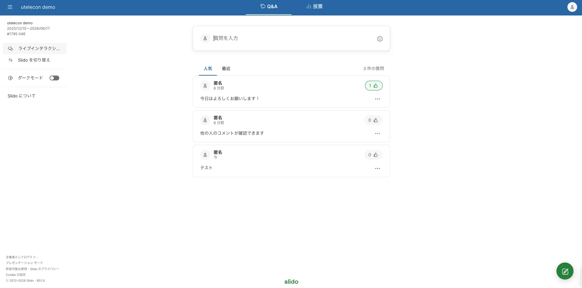 Slidoの画面でどのようなことができるかについては,「Slidoで受講者ができること」をご覧ください.