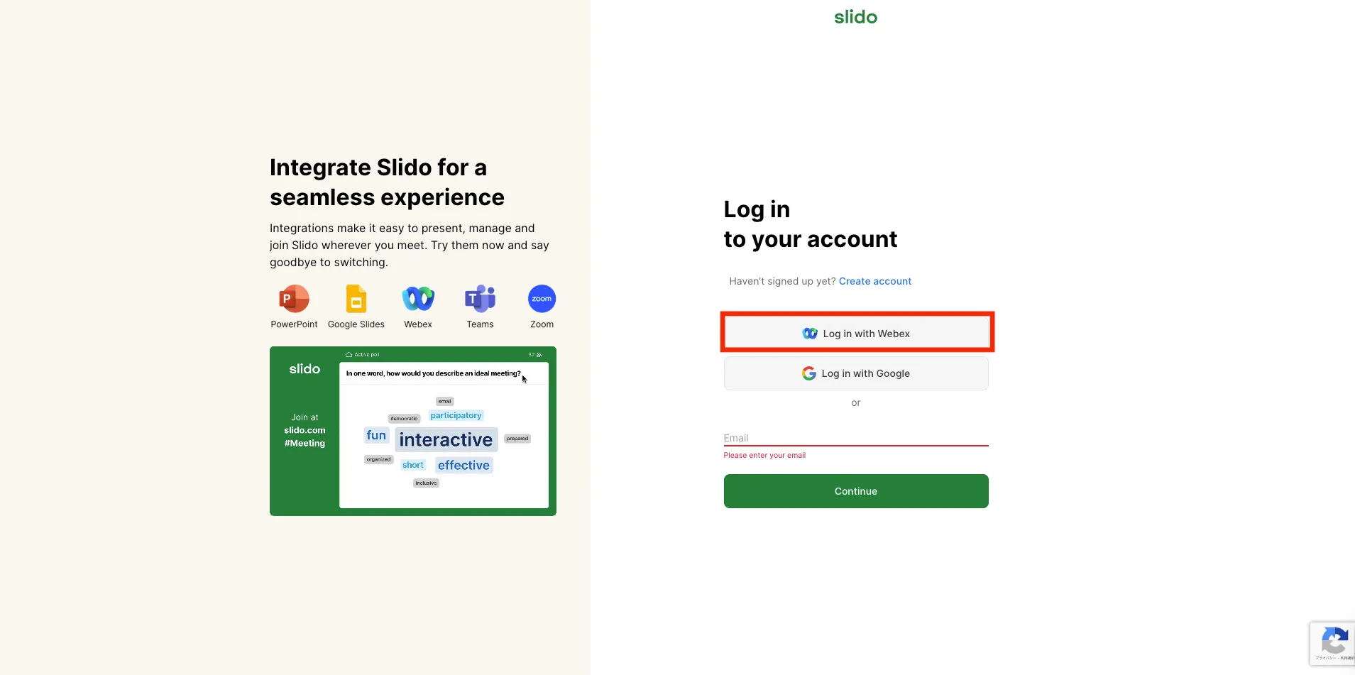 自身でイベントを主催する場合は,Slidoへのログインが必要です.イベントに参加するだけであれば,この手順は必要ありません.