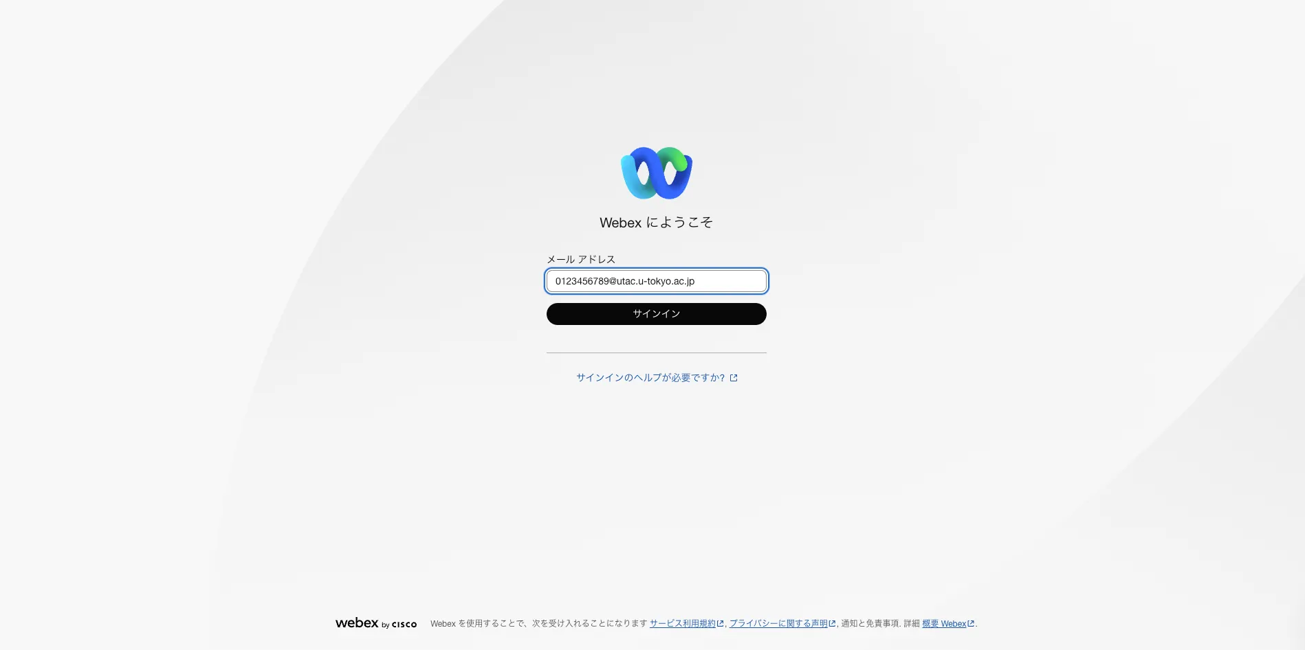- Webexのサインイン画面が開くので,UTokyo Account(数字10桁の共通ID +