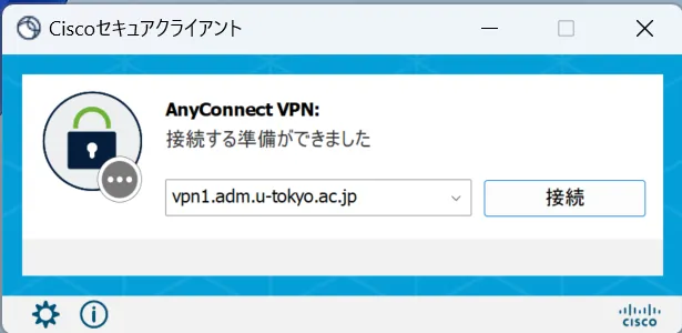 手順E: 準備編でインストールしたCisco Secure Clientを起動すると,以下のような画面が出てきます.VPN接続先として vpn1.adm.u-tokyo.ac.jp と入力し,「接続」ボタンをクリックします.