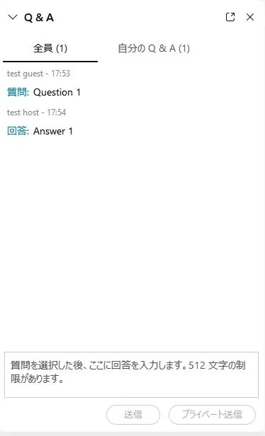 - 主催者は「プライベート送信」をクリックすると「プライベートに回答」「保留」「却下」を選ぶことができます.全参加者に見せるべきでない回答は「プライベートに回答」,調査が必要で回答に時間がかかる場合は「保留」,などとすることができます.