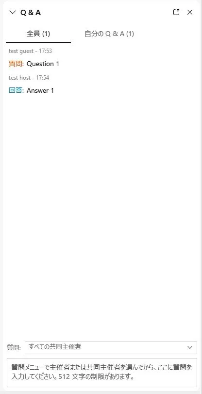 - 左側が主催者側の様子,右側が参加者側からの様子です.質問に対する回答が揃うと,両方が全参加者に共有されます.途中からイ ベントに参加した参加者も過去のQ&Aを読むことができます.