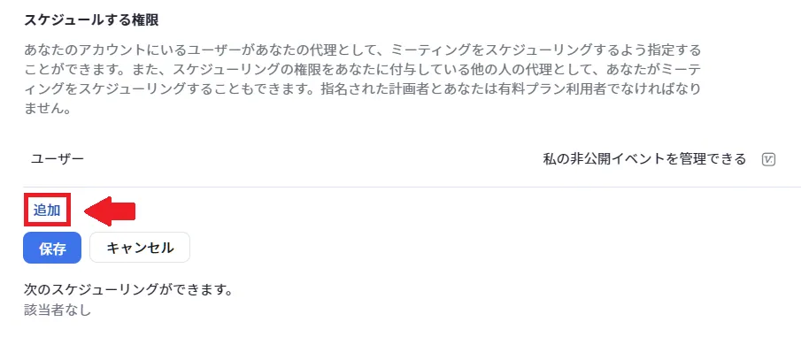 - 「ミーティング」タブを選択し,「その他」欄の「スケジュールする権限」まで移動し,[追加]を選択してください.