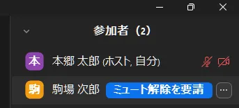 表示された参加者の一覧のうち,ホストになっている参加者には名前の右側に「(ホスト)」の表示があります.