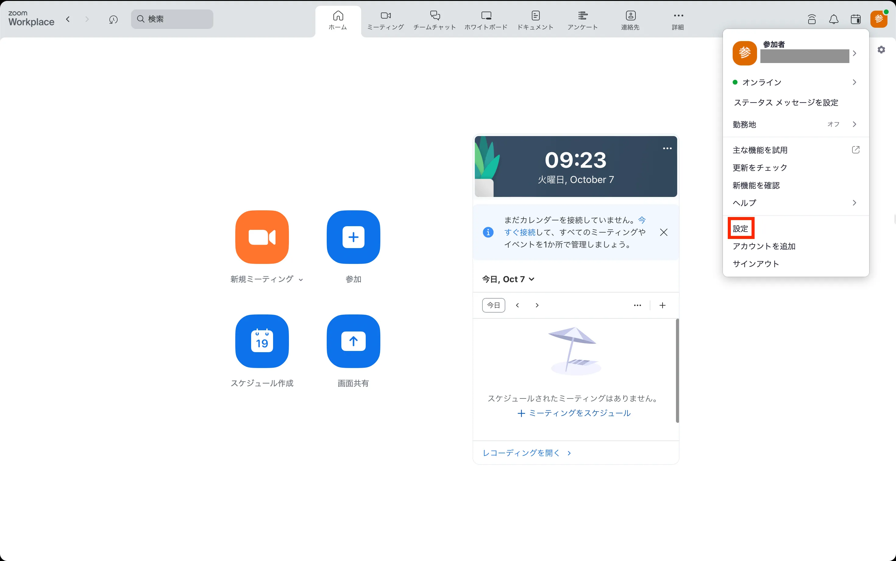 1. Zoomアプリの画面右上のアイコンを押し,「設定」を選択してください.